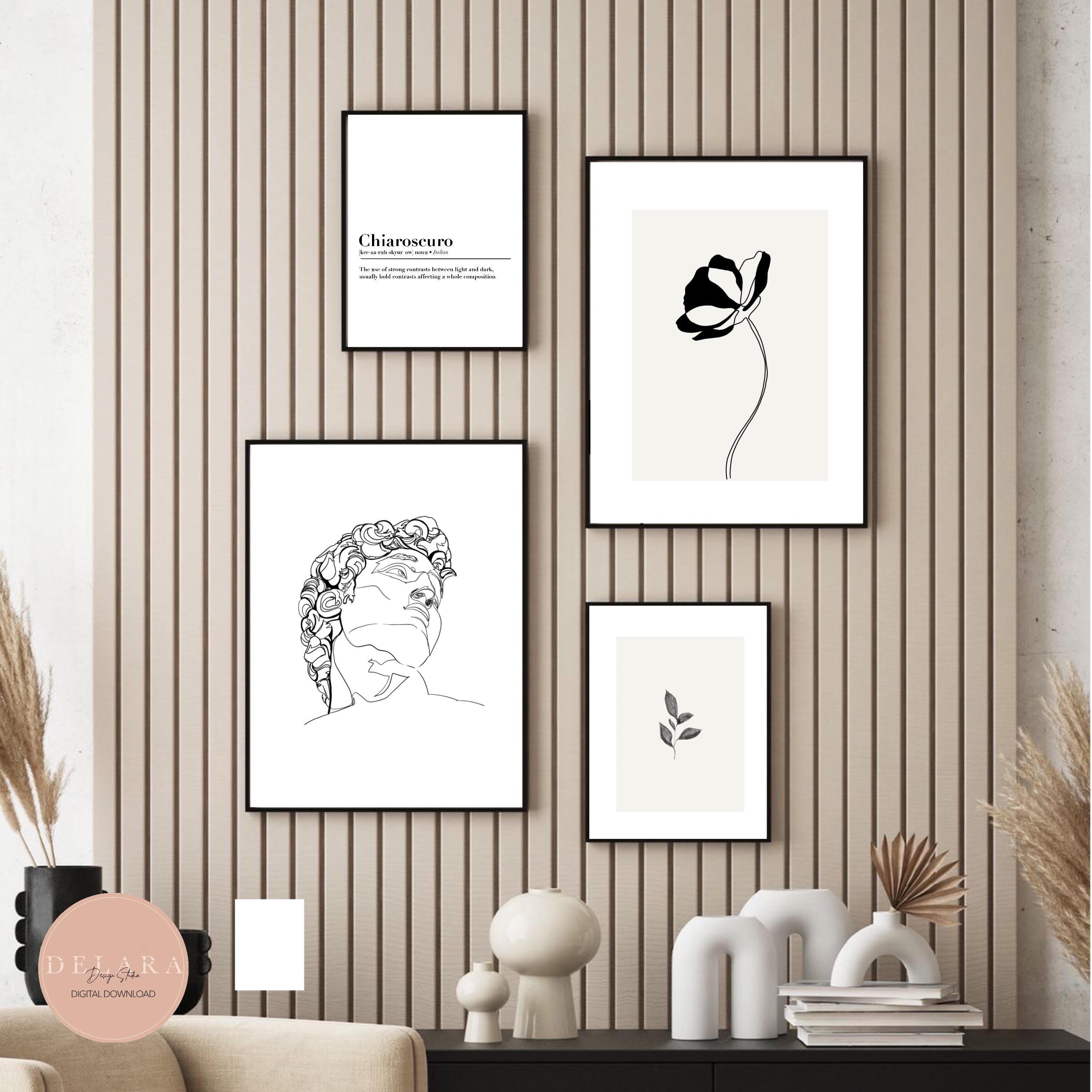 "Classical Harmony" invites viewers to appreciate the seamless integration of classical sculpture and organic elements, highlighting the perpetual allure of black-and-white artistry. The serene expression of David is surrounded by intricate floral designs, evoking a sense of timeless protection and tranquility.